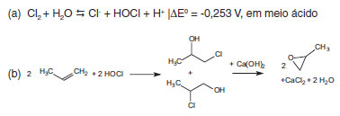 Cloreto de vinila, o precursor do PVC, é o 4º produto orgânico mais produzido em quantidade no mundo.21 O produto intermediário DCE é obtido pela adição de gás cloro ao etileno (Esquema 1a) ou pela oxicloração do etileno (Esquema 1b) e subsequentemente transformado em cloreto de vinila pela eliminação de cloreto de hidrogênio do DCE (Esquema 1c).21 Enquanto o PVC obtido por meio da polimerização radicalar do cloreto de vinila contém aproximadamente 56% em massa de cloro, os PUs obtidos pela poliadição de diisocianotolueno e polipropilenoglicol não contêm cloro nas suas formulações finais, mas o gás cloro é indispensável para obter o óxido de propileno, o qual resulta da reação de hipoclorito, obtido pelo desproporcionamento de gás cloro com água (Esquema 2a), com propileno, seguida de uma de-hidroclorização em meio básico (Esquema 2b).21
