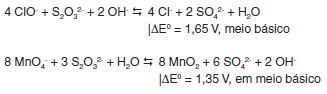 O desproporcionamento também é usado para tratar o cloro residual no tubo de ensaio depois do término dos experimentos. A adição de uma solução diluída de hidróxido de sódio (2 mol L-1), por meio de uma seringa, ao tubo de ensaio contendo o gás cloro restante leva ao seu desproporcionamento em cloreto e hipoclorito. O hipoclorito e o restante do permanganato devem ser reduzidos com tiossulfato de sódio, como mostra o Esquema 7. O dióxido de manganês precipitado é separado por filtração e estocado com os resíduos metálicos de menor toxicidade até o tratamento final adequado. O filtrado contendo somente íons de potássio e sódio, junto com ânions atóxicos, é neutralizado e pode ser descartado na rede de esgoto.