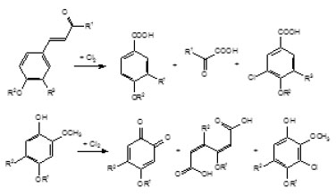 ![]() Esquema 13. Oxidação das unidades básicas de lignina e formação de compostos aromáticos clorados durante o branqueamento de celulose com cloro elementar (adaptada da ref. 45)
