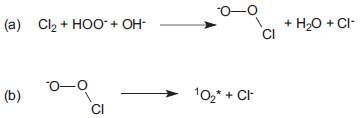 Na reação de Mallet (Esquema 14), a reação entre o cloro elementar e o peróxido de hidrogênio em meio básico gera peroxi-hipoclorito (Esquema 14a).40,41 A etapa que controla a velocidade da formação de dioxigênio é a cisão de cloreto (Esquema 14b). Tanto o peroxi-hipoclorito como o ânion cloreto possuem todos os seus elétrons emparelhados, ou seja, possuem um spin total igual à zero. Seguindo a regra de conservação de spin, o dioxigênio formado também deve ter um spin igual à zero,41,47 ou em outras palavras, se formar em estado excitado singlete (1O2*).