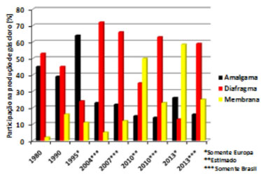 ![]() Figura 2. Participação percentual dos processos eletrolíticos na produção mundial (1980, 1990, 2010),8 europeia (1995,8 201318) e brasileira (2004, 2007, 2010, 2013)15 de gás cloro