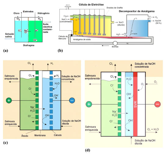 ![]() Figura 1. Celas eletrolíticas para produção de gás cloro e hidróxido de sódio: (a) Processo Diafragma,9 (b) Processo Amálgama,10 (c) Processo Membrana (adaptada de ref. 11 com permissão de Wiley-VCH), (d) Processo Membrana com cátodo despolarizado de oxigênio (SVK) (adaptada de ref. 11 com permissão de Wiley-VCH)