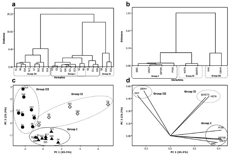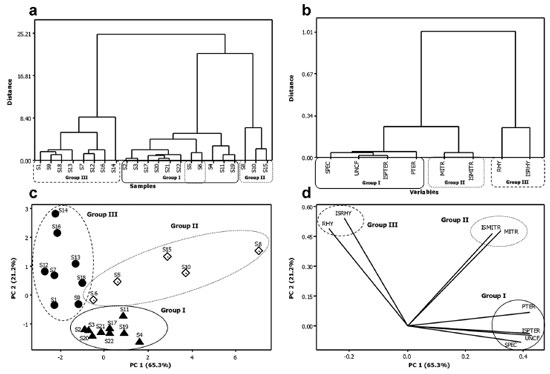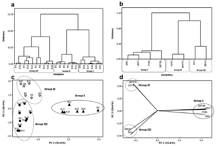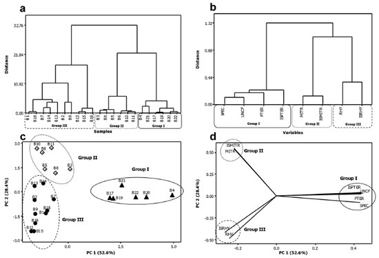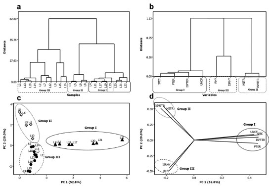 ![]() Figure 4. HCA and PCA analyses of U. tomentosa leaves samples considering only the oxindole alkaloids: (a) dendrogram of the samples using Ward's as linkage method and the Euclidean distance, (b) dendrogram of the variables using the single linkage method and correlation coefficient distance, (c) score and (d) loading plots (PC1 versus PC2) from the chemical data. Group I - predominance of POA with cis D/E ring junction, namely, speciophylline (SPEC), uncarine F (UNCF), pteropodine (PTER) and isopteropodine (ISPTER); Group II - predominance of POA with trans D/E ring junction, namely, mitraphylline (MITR) and isomitraphylline (ISMITR); Group III - predominance of TOA, namely, rhyncophylline (RHY) and isorhyncophylline (ISRHY)