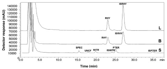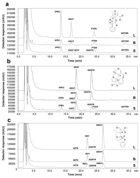 ![]() Figure 7. HPLC-PDA chromatograms of oxindole alkaloids in (S) stem bark, (B) branches and (L) leaves from U. tomentosa sample 2. Speciophylline (SPEC), uncarine F (UNCF), pteropodine (PTER), isopteropodine (ISPTER), mitraphylline (MITR) isomitraphylline (ISMITR), rhyncophylline (RHY) and isorhyncophylline (ISRHY). Detection at 245nm