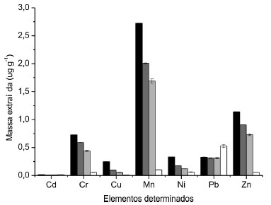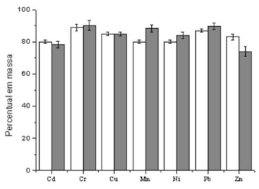 ![]() Figura 4. Sorção e dessorção dos elementos. Barras brancas; sorção realizada em solução a 50 µg L-1, pH 6,0 ± 0,2 e força iônica 0,01 mol L-1 de NaNO3, com tempo de imersão de 6 h. Barras cinzas; dessorção após eluição dos discos (12% de montmorilonita e agarose 1,5%) com ácido nítrico concentrado seguido de diluição