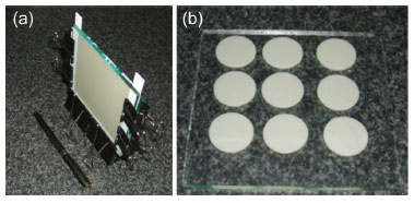 ![]() Figura 3. (a) suporte preenchido com o gel (montmorilonita imobilizada em agarose) na proporção de 12% argilomineral e 1,5% de agarose, tamanho aproximado de 11 cm × 10,5 cm. (b) discos obtidos no diâmetro de 2,5 cm e espessura de 1 mm