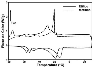 ![]() Figura 2. Curvas de DSC dos ésteres etílicos e metílicos do óleo de Butia capitata (butiá)