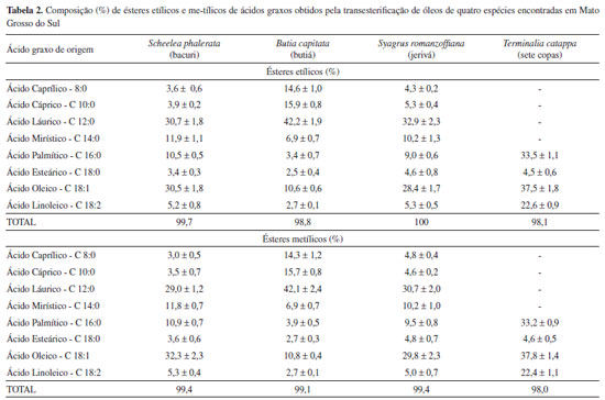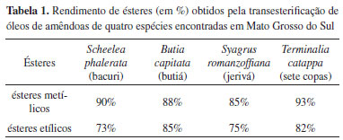 RESULTADOS E DISCUSSÃO Os teores de óleo de amêndoas das espécies, obtidos a partir da extração por Soxhlet foram os seguintes: 34,2% (S. phalerata), 23,0% (B. capitata), 19,2% (S. romanzoffiana) e 46,1% (T. cattapa). Após purificação, a fração lipídica foi submetida a reação de transesterificação usando KOH/metanol e KOH/etanol, resultando em misturas de ésteres com rendimentos que variaram de 75% até 93% (Tabela 1). A formação dos ésteres foi confirmada por espectros de RMN de 1H. O surgimento de singletos a δ 3,6 ppm, o que corresponde a grupos -OCH3 de ésteres, foi utilizado para avaliar o grau de pureza e a conversão em ésteres metílicos. Na reação de transesterificação com etanol, observou-se no espectro de RMN de 1H somente um quarteto em δ 4,01-4,415 ppm, dos prótons metilênicos da etoxila (-O-CH2-CH3), o que confirma a conversão em ésteres etílicos. Uma vez que o multipleto a δ 4,2-4,4 ppm, correspondente aos grupos de metileno da porção glicerol em trigliacilglicerídeos, desapareceu, pode-se observar a formação dos ésteres. Nas análises cromatográficas, foram identificados oito ésteres metílicos/etílicos de ácidos graxos obtidos das espécies S. phalerata, B. capitata, S. romanzoffiana (Arecaceae), e quatro ésteres foram identificados na mistura obtida pela transesterificação a partir do óleo T. cattapa (Combretaceae). A concentração de ésteres de todas as misturas obtidas ficou acima de 98,0%. A composição das misturas de ésteres é mostrada na Tabela 2.