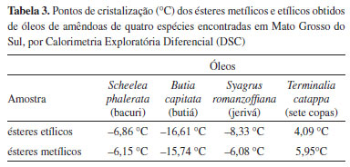 Na Tabela 3 observa-se as temperaturas de início de cristalização dos ésteres aqui estudados. As temperaturas de cristalização dos ésteres metílicos/etílicos derivados dos óleos de S. phalerata, B. capitata, S. romanzoffiana e T. cattapa foram -6,15 ºC/-6,86 ºC, -15,74 ºC/-16,61 ºC, -6,08 ºC/-8,33 ºC e 5,95 ºC/4,09 ºC, respectivamente. Os ésteres que apresentaram as menores temperaturas de cristalização foram os obtidos a partir dos óleos da família Arecaceae (S. phalerata, B. capitata, S. romanzoffiana), apresentando temperaturas negativas abaixo de -6,0 ºC, enquanto T. cattapa apresentou temperaturas positivas de início cristalização.