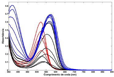 ![]() Figura 1. Espectro UV-Vis para as amostras de antocianinas do repolho roxo em diferentes valores de pH. (-) amostras em pH extremamente ácido (pH 1,89 a 3,37). (-) amostras em pH ácido e neutro (pH 3,78 a 7,15). (-) amostras em pH alcalino (pH 8,08 a 12,01)