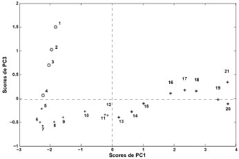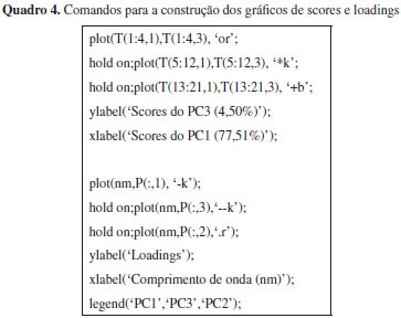 Para o modelo foram escolhidos 3 PCs, que juntos correspondem a uma percentagem de variância acumulada de 98,90%. Na escolha do número de PCs não existe uma regra absoluta, entretanto, a observação de variações abruptas na quantidade de variância explicada por cada PC pode ser um critério de escolha, assim como a interpretação química e/ou física de seus significados. Ressalta-se ainda que PCs que expliquem muito pouca variância, no nível do ruído dos dados, não podem ser interpretados de maneira confiável. O próximo passo consiste em plotar os gráficos de scores e loadings. Nesse caso, a melhor distinção entre as amostras foi observada com as PCs 1 e 3. Isso não significa que a PC2 não tenha importância para o modelo, no entanto, a PC2 representa um padrão dos dados que não é fundamental para a discriminação, nesse caso. Os comandos do Quadro 4 permitem a construção dos gráficos de scores e loadings.