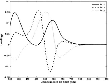 O gráfico referente aos loadings dos PCs 1, 2 e 3 é apresentado na Figura 3. A partir do gráfico dos loadings pode-se encontrar quais as partes do espectro que são responsáveis pela separação entre as amostras, observada no gráfico dos scores. As amostras de antocianinas do repolho roxo em pH extremamente ácido (amostras 1 a 4) são agrupadas na parte negativa de PC1 e positiva de PC3 no gráfico dos scores. Trazendo essa informação para o gráfico dos loadings, verifica-se que o PC1 não apresenta partes negativas, o que pode ser explicado pelo fato de a matriz de dados ter sido centrada na média. Por outro lado, a parte positiva dos loadings de PC3 evidencia a existência de uma banda centrada em 520 nm, a qual, segundo a literatura,24 é característica do cátion flavílico. Analisando conjuntamente o gráfico dos scores e dos loadings, no que se refere às amostras agrupadas na parte negativa de PC1 e PC3 (amostras 5 a 12) dos scores, observa-se que os loadings do PC1 não apresentam sinal na parte negativa, enquanto os loadings de PC3 apresentam uma banda centrada em torno de 580 nm na parte negativa. Esta banda é referente às formas predominantes das antocianinas em função do pH dessas amostras. Nas amostras 13 a 21, cujo pH do meio era alcalino, o agrupamento observado no gráfico dos scores se deu em função da parte positiva de PC1. Na parte positiva dos loadings de PC1 verificam-se duas bandas intensas, uma centrada em 380 nm e outra em 590 nm. Esses loadings representam as absorções características para as formas de antocianinas presentes em meio alcalino. Dessa forma, foi possível observar que os loadings do PC3 são os responsáveis pela explicação da distinção que ocorre entre as amostras no gráfico dos scores em meio extremamente ácido e no meio ácido a neutro. Já os loadings do PC1 explicam a distinção das amostras que se encontram no meio alcalino. Observando os loadings do PC2 verifica-se um comportamento intermediário ao observado em PC1 e PC3 que pode ser atribuído ao equilíbrio entre as espécies de antocianinas presentes no meio.23,24