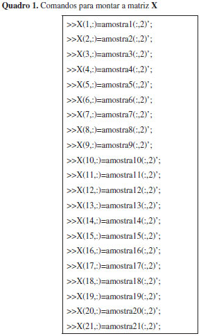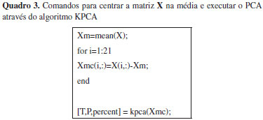Para aplicar PCA, os espectros da matriz X foram centrados na média e o algoritmo KPCA foi executado de acordo com o tutorial proposto por Souza e Poppi.16 O Quadro 3 apresenta os comandos para a execução dessas operações de acordo com o tutorial.