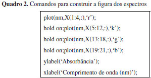 Para construir a Figura 1 no Matlab/Octave, os comandos do Quadro 2 podem ser utilizados. Na primeira linha do Quadro 2 tem-se que, a partir do comando "plot", os espectros da matriz X serão plotados em função dos comprimentos de onda (nm). A letra 'r' indica que os espectros das amostras 1 a 4 (meio extremamente ácido) serão plotados na cor vermelha. A letra 'k' indica que os espectros das amostras 5 a 12 (meio ácido e neutro) serão plotados na cor preta. A letra 'b' indica que os espectros das amostras 13 a 121 (meio alcalino) serão plotados na cor azul. O comando ' hold on' significa que os espectros das amostras nos diferentes meios serão plotados no mesmo gráfico. Nas duas últimas linhas do Quadro 2, os comandos possibilitam inserir nomes nos eixos y e x, respectivamente.