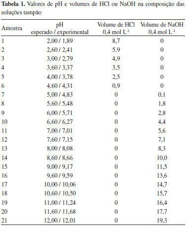 RESULTADOS E DISCUSSÃO A Tabela 1 apresenta as proporções de solução de HCl 0,4 mol L-1 ou NaOH 0,4 mol L-1 empregadas no preparo das 21 soluções tampão que foram utilizadas no trabalho. Os respectivos valores de pH (esperado e medido experimentalmente) para cada uma das soluções também são apresentados.