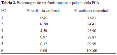 No Quadro 3, a primeira sequência de comandos foi utilizada para centrar os dados na média. Centrar os dados na média consiste em calcular a média das intensidades para cada comprimento de onda (Xm) e subtrair cada um desses valores médios (Xmc) de todos os valores de absorbância medidos para os respectivos comprimentos de onda. Ao executar o próximo comando, para a realização da análise PCA, os resultados serão os valores de scores (T), loadings (P) e a percentagem de variância explicada em cada componente principal (percent). A Tabela 2 apresenta a percentagem de variância capturada pelo modelo PCA construído.