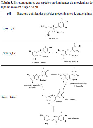 A partir da Figura 2 verificou-se que a separação foi condizente com o reportado pela literatura.23,24 Estruturalmente, as antocianinas são caracterizadas pela presença de um esqueleto contendo 15 átomos de carbono na forma C6-C3-C6, que absorvem fortemente na região visível do espectro, conferindo uma grande variedade de cores, dependendo do pH na qual está presente.24 De modo geral, em meio extremamente ácido (até pH ~3), as antocianinas apresentam coloração intensamente avermelhada devido ao predomínio da forma cátion flavílico - amostras de 1 a 4 na Figura 2. Nas amostras de 5 a 12 da Figura 2 o pH estava compreendido entre 3,78 e 7,15 e as formas de antocianinas predominantes são a pseudobase carbinol em equilíbrio com a forma anidrobase quinoidal. Ainda na Figura 2, o valor de pH das amostras 13 a 21 estava entre 8,08 e 12,01, intervalo no qual os equilíbrios predominantes ocorrem entre as espécies anidrobase quinoidal em suas formas ionizadas e na forma de chalconas. A Tabela 3 apresenta as mudanças estruturais apresentadas pelas antocianinas do repolho roxo de acordo com o valor de pH do meio.