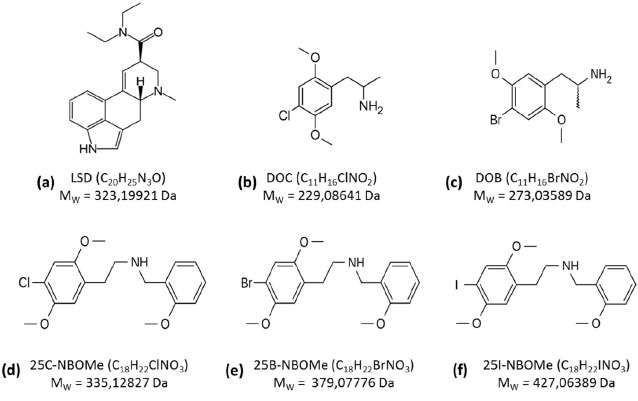 Entre os princípios ativos apreendidos no estado do Espírito Santo como mostrado na Tabela 1, é destacado neste trabalho o 25I-NBOMe ou 2-(4-iodo-2,5-dimetoxifenil)-n-[(2-metoxifenil)metil]etamina, Figura 1f. O 25I-NBOMe é uma droga psicodélica descoberta em 2003 pelo químico Ralf Heim da Universidade de Berlim, que foi classificada como droga ilícita pela União Europeia em 25 de setembro de 2014, por não possuir propósito médico ou legítimo. No Brasil, ela foi proscrita pela Anvisa (Lista F2) na portaria 344/98 em 18 de fevereiro de 2014. Além do 25I-NBOMe, as substâncias 25C-NBOMe e 25B-NBOMe também foram proscritas no mesmo período e vem sendo apreendidas em outros estados brasileiros (veja suas estruturas químicas na Figura 1d-e). Todas essas substâncias têm como principal objetivo imitar os efeitos psíquicos de drogas ilícitas, por exemplo, o LSD10 (Figura 1a) e o MDMA.6,10,11 Devido às estruturas químicas semelhantes existentes entre as moléculas de 25C-NBOMe, 25B-NBOMe e 25I-NBOMe (Figuras 1d-f),12 a caracterização inequívoca delas por técnicas forenses convencionais (testes colorimétricos, cromatografia de camada fina (CCD) e cromatografia gasosa acoplada à espectrometria de massas (CG-EM)) torna-se um desafio. Destacam-se, ainda, nesse mercado ilícito, os compostos DOB (2,5-dimethoxi-4-bromoanfetamina) e DOC (2,5-dimetoxi-4-cloroanfetamina), Figuras 1b-c.12