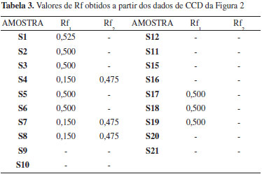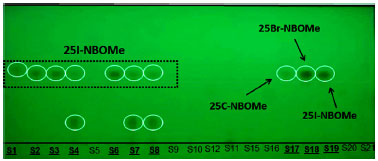![]() Figura 2. Sistema de CCD usando como eluente uma mistura ternária contento hexano/dietilamina/tolueno (75/15/10 v/v %). As amostras em negrito e sublinhadas apresentaram valores de Rf similares podendo corresponder a classe de compostos NBOMes (Tabela 3) ![]()