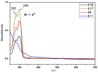 ![]() Figura 3. Espectro eletrônica na região do UV-Vis para soluções contendo o princípio ativo LSD (amostra S11), 25C-NBOMe (amostra S17), 25B-NBOMe (amostra S18) e 25I-NBOMe (amostras S6)
