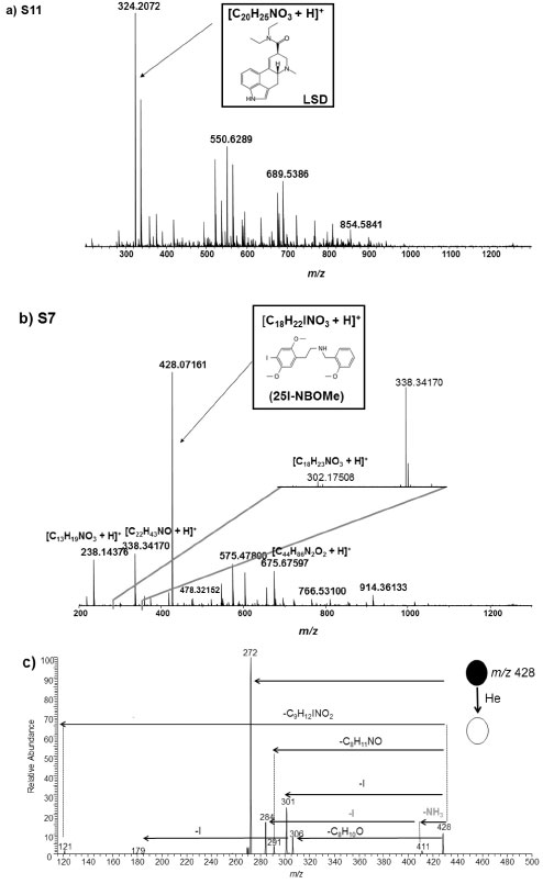 ESI(+) FT-ICR MS E ESI(+)-MS/MS A Figura 6a-b mostra os espectros de ESI(+)-FT-ICR MS para as amostras de selo contendo os compostos LSD (S11) e 25I-NBOMe (S7). O composto LSD (Figura 6a) pode ser identificado a partir da detecção do sinal de m/z 324,2072 correspondendo à molécula na sua forma monoprotonada, o cátion [M + H]+, sendo M = C20H25N3O, com exatidão de massas de -0,5 ppm (m/zteórico = 324,2070) e DBE = 10. Já a molécula de 25I-NBOMe presente na amostra S7, Figura 6b, pode ser detectada na forma de íon [C18H22INO3 + H]+ com erro de massa de 0,2 ppm e DBE 8. O DBE = 8 se deve à presença de dois anéis aromáticos na estrutura do composto 25I-NBOMe, sendo que cada anel contribui com 4 insaturações (DBE = 4). Além do 25I-NBOMe, outros sinais são detectados como os íons de m/z 238,1438, 302,1751 e 338,3417. A Tabela 5 mostra os valores de m/z medido e teórico, fórmula molecular, DBE e erro de massas encontrado para esses sinais. Baseado nos valores de DBE e da fórmula molecular obtida a partir de uma exatidão de massas menor do que 1 ppm, duas estruturas químicas são sugeridas para os íons de m/z 302 e 238: os compostos 25H-NBOMe e um derivado da anfetamina, o metilenodioximetoxietilanfetamina, respectivamente, Tabela 5.