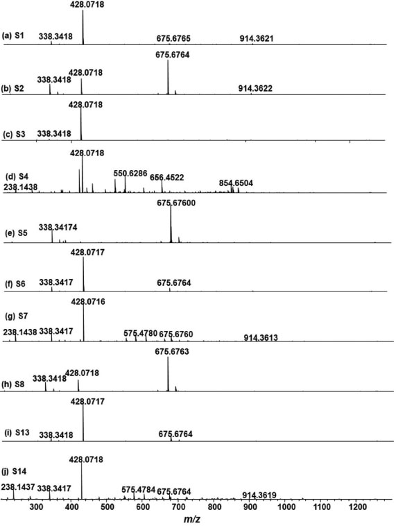 A Figura 8 mostra o espectros de ESI(+)FT-ICR MS de outras nove amostras de selos de duas diferentes apreensões da PC do ES (S1-S8 e S13-S14). Um perfil químico similar é obtido em quase todas as amostras, onde na maioria dos casos a espécie 25I-NBOMe apresenta a maior intensidade relativa. Similar aos dados de ATR-FTIR e CCD, a amostra S5 não contem o composto 25I-NBOMe, sendo identificado apenas os íons de m/z 338 e 675. O íon de m/z 338 apresenta fórmula molecular com M = C22H43NO e DBE = 2, enquanto que o íon de m/z 675 corresponde ao seu respectivo dímero [2M + H]+, Tabela 5.