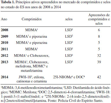 Do ponto de vista analítico, pode-se considerar um grande desafio a correta identificação desta classe de drogas. A dificuldade em se analisar as designer drugs por métodos estabelecidos se dá devido à diversidade das modificações ocorridas nas moléculas e à velocidade com que elas surgem no mercado, sendo mais rápido o desenvolvimento de novas moléculas do que de protocolos analíticos para identificação inequívoca desses compostos baseado, por exemplo, usando métodos colorimétricos ou de cromatografia planar. Portanto, para acompanhar a evolução do mercado de drogas ilícitas é necessário adaptar continuamente os métodos e metodologias de análises existentes ou utilizar métodos analíticos modernos que permitam a determinação correta destes compostos. Neste contexto, a produção ou a aquisição de padrões de referência é essencial.1 Dados da coordenação geral do Departamento da Polícia Civil sobre apreensões de drogas sintéticas como ecstasy e selos de dietilamida do ácido lisérgico (LSD) no estado do Espírito Santo mostram um aumento de 300 a 400% nos anos de 2012 e 2014 quando comparamos com o período de 2008 a 2011. Esse resultado é devido às apreensões de novas drogas sintéticas, principalmente no mercado de ecstasy e LSD, como mostrado na Tabela 1.