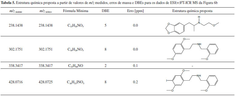 CONCLUSÃO Neste artigo, diferentes métodos analíticos (CCD, UV-Vis, ATR-FTIR, GC-MS e ESI(+)-FT-ICR MS) foram empregados na caracterização de selos contendo, principalmente, o princípio ativo 25I-NBOMe. Ao analisar inicialmente métodos de menor seletividade e sensibilidade analítica, a técnica de CCD mostrou-se eficiente para identificar manchas referentes aos compostos 25C-, 25B- e 25I-NBOMe (todos com Rf de ≈ 0,50). Vale destacar que apesar das massas molares dos compostos 25C-, 25B- e 25I-NBOMe serem diferentes, suas estruturas químicas semelhantes proporcionaram um mesmo fator de retenção ou Rf. Para os compostos DOB, DOC e LSD, nenhuma mancha foi detectada. Provavelmente, essas espécies estão em menores concentrações. Adicionalmente, a técnica de UV-Vis pode ser útil na identificação dos compostos NBOMes, onde, em todos os casos, duas bandas foram identificadas na região do ultravioleta com máximos em 280 e 300 nm. Entre todos os métodos analíticos empregados, a técnica de ATR-FTIR destaca-se por preservar a integridade físico-química da prova material: o selo. A combinação de ATR-FTIR com métodos multivariados e padrões de referência pode ser uma excelente alternativa na identificação e classificação das designer drugs, levando em consideração sempre as figuras de mérito como linearidade, limite de detecção, quantificação e seletividade. As técnicas de GC-MS e ESI-MS apresentaram melhores seletividades analíticas entre os métodos utilizados. Além do perfil cromatográfico, a técnica de GC-MS é capaz de informar a impressão digital do 25I-NBOMe através do espectro de EI-MS e diferenciá-los em relação as outras designer drugs. Esta técnica é tradicionalmente utilizada pelos laboratórios forenses e bastante divulgada na literatura.17,18 A identificação do íon molecular (M+) para a molécula de 25I-NBOMe (Mw = 427 Da) pode se realizada por experimentos de CI-MS ou pela diminuição da energia de fragmentação na fonte de EI (< 70 eV). Para contornar o problema de identificação do íon molecular, a espectrometria de massas de alta resolução (como a técnica de ESI-MS) permite a detecção da fórmula mínima do 25I-NBOMe (C18H22INO3), seu grau de insaturação (DBE = 8) e sua estrutura química (a partir de experimentos de CID) com exatidão de massas menor do que 1 ppm. Além disso, os resultados de ATR-FTIR e ESI-MS/MS sugerem a presença de um isômero da molécula de 25I-NBOMe. Em geral, pode concluir que técnicas analíticas de alta resolução como espectrometria de massas e ressonância magnética nuclear são fundamentais na caracterização de drogas de abuso ou na produção de material de referência.