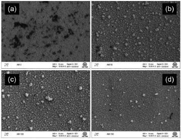 ![]() Figura 2. Microscopias eletrônicas de varredura para os eletrodos de FTO - a) sem modificação e com b) 50 ciclos; c) 100 ciclos; d) 150 ciclos de eletrodeposição de ouro. Todas as imagens apresentam ampliação de 10000 vezes e tensão de aceleração de 20 kV