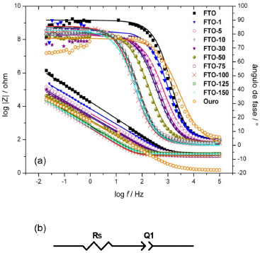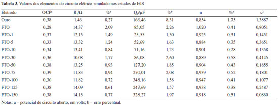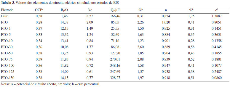 O estudo dos eletrodos via EIE foi em potencial de circuito aberto. O circuito elétrico simulado apresentado na Figura 3, propõe a existência de elementos comuns a esse tipo de célula eletroquímica: a resistência da solução (Rs), que é própria do eletrólito suporte, associada em série a um elemento de fase constante, (Q1), que representa a formação da dupla camada elétrica na interface eletrodo-solução. A proposição desse circuito foi feita de forma que pudesse representar todos os eletrodos em estudo, desde o FTO sem modificação até o eletrodo de ouro não nanoestruturado. Os valores obtidos para cada um dos elementos do circuito simulado, assim como os valores de potencial de circuito aberto (OCP) são apresentados na Tabela 3.
