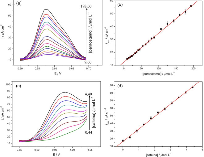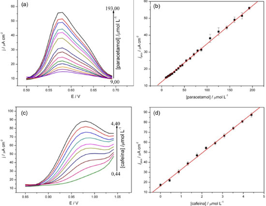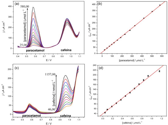 ![]() Figura 7. Voltamogramas de pulso diferencial com variação da concentração de a) paracetamol na presença de 500 µmol L-1de cafeína e c) de cafeína na presença de 100 mmol L-1de paracetamol. Curvas analíticas para determinação da relação entre a corrente de pico e a concentração de b) paracetamol e d) cafeína
