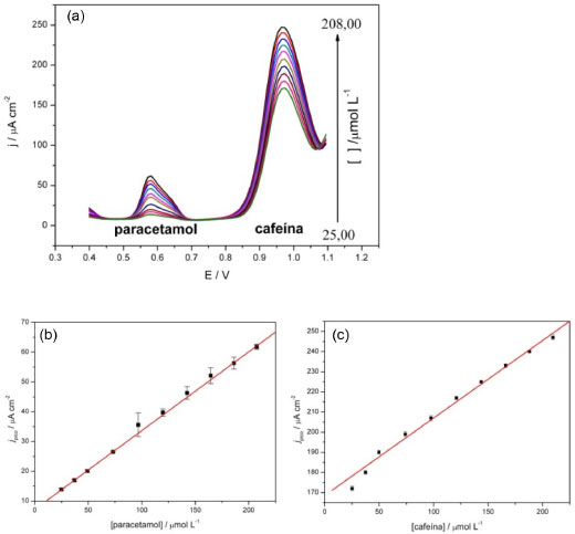 ![]() Figura 5. a) Voltamogramas de pulso diferencial para adições conjuntas de paracetamol e cafeína. Curvas analíticas para determinação da relação entre a corrente de pico e a concentração de b) paracetamol e c) cafeína