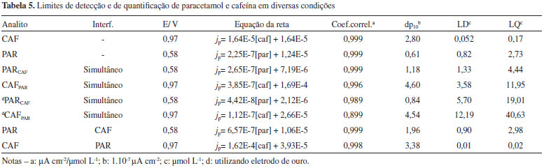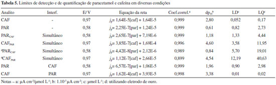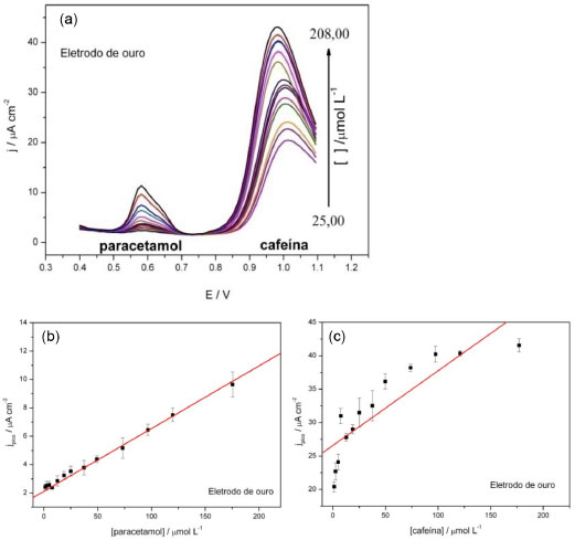 Observa-se na Figura 6 que o eletrodo de ouro não é eficiente na determinação da cafeína; não há uma relação linear entre a densidade de corrente e a concentração desse analito. Esses experimentos mostraram que os eletrodos nanoparticulados preparados apresentam melhores características eletroquímicas para a detecção da cafeína. Como alguns medicamentos à base de paracetamol apresentam cafeína em sua constituição, foram feitos testes de determinação de cada uma das espécies na presença da outra, em concentrações iniciais elevadas. Considerando a cafeína como um possível interferente, foi feita a determinação da concentração de paracetamol na presença de uma concentração inicial de cafeína 20 vezes maior. Também foram feitas medidas de VPD no caso em que o paracetamol é o interferente na determinação da concentração de cafeína. A concentração inicial de paracetamol utilizada foi de 2000 vezes maior que a da cafeína. Os voltamogramas para ambos os casos, assim como as respectivas curvas analíticas obtidas são apresentados na Figura 7.