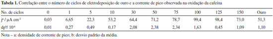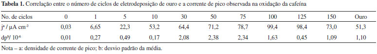 Analisando os resultados obidos foi verificada a formação do pico de oxidação da cafeína, quando comparado com os voltamogramas realizados unicamente em eletrólito suporte. A oxidação do ouro, nas condições dos experimentos realizados, ocorre em potencial de aproximadamente 1,2 V e a sua redução em torno de 0,95 a 1,00 V. A literatura relata que a oxidação da cafeína é irreversível frente a diversos eletrodos.12,19,24,46,59,60 Desta forma, os picos de redução em ~0,85 V podem ser respectivos a subproduto de oxidação da cafeína. A Tabela 1 relaciona os valores das correntes de pico de oxidação da cafeína encontrados para cada um dos eletrodos produzidos, assim como para os eletrodos de ouro e de FTO não modificado.