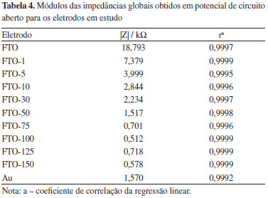 Na Figura 3 foi atribuído um comportamento de maior característica capacitiva que difusional aos eletrodos, uma vez que os ângulos de fase tendem a valores superiores a 75º. Isso demonstra a formação da dupla camada elétrica na interface eletrodo-solução, em que a superfície do eletrodo carregada atua como uma das placas de um capacitor e a camada organizada de contra-íons da solução, a outra. Pelas curvas dos módulos da impedância foi observado que em todos os eletrodos a resistência da solução tende a valores muito próximos entre si, tendo sido encontrado o valor médio de (13 ± 1) Ω. Esse fato mostra que as soluções de eletrólito suporte apresentavam as mesmas concentrações de íons e que as montagens da célula eletroquímica foram sempre feitas da mesma forma, mantendo-se constante a distância entre os eletrodos de trabalho e de referência; contudo, essa observação não é válida para o eletrodo de ouro, pois o seu formato geométrico não permitiu uma montagem da célula eletroquímica cujas distâncias entre eletrodos fossem as mesmas que nos estudos com FTO. Na Tabela 3 é possível observar que os erros obtidos nas simulações são relativamente baixos; nota-se também que a capacitância de Q1 aumenta com o aumento do número de camadas de ouro eletrodepositadas sobre o eletrodo, desde FTO-1 a FTO-100; eletrodos com mais de 100 ciclos apresentaram queda nos valores de Q1. Esses dados se correlacionam diretamente com a capacidade de detecção descrita na Figura 1, em que o eletrodo FTO-100 se mostrou o mais eficaz. O maior valor de capacitância desse eletrodo pode estar relacionado à menor distância entre as duas camadas elétricas (a superfície carregada do eletrodo e o plano de íons da solução), facilitando assim a ocorrência dos processos redox em sua superfície. A partir da Figura 3 a impedância global de cada um dos eletrodos foi obtida. Os cálculos foram feitos por meio da regressão linear da região de inclinação negativa de cada curva e o valor de log|Z| obtido na interseção da reta simulada com a reta log(f) = 0 (ou x = 0). Os valores encontrados são apresentados na Tabela 4.