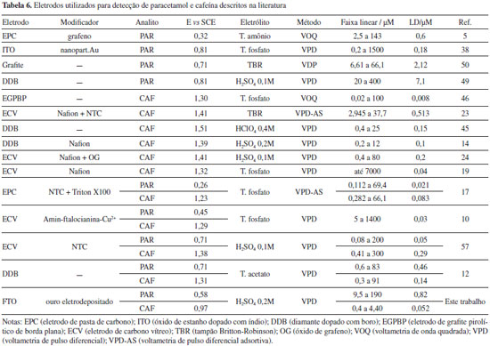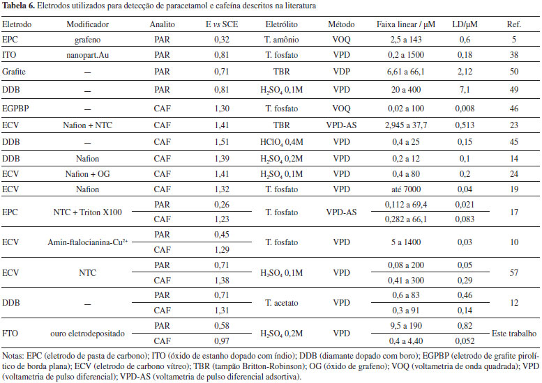 Nota-se que os limites de detecção (LD) de paracetamol e cafeína simultaneamente são cerca de 4 vezes superiores para o eletrodo de ouro quando comparados aos valores encontrados para o FTO-100. Uma comparação com outros eletrodos encontrados na literatura para detecção dos analitos estudados é mostrada na Tabela 6. Além de ter se mostrado mais eficiente que o eletrodo de ouro não nanoestruturado, o eletrodo produzido nesse trabalho apresenta como vantagens a não necessidade de tratamentos prévios à eletrodeposição, dispensa incorporação de matrizes poliméricas, potenciais de oxidação do paracetamol (0,58 V vs. ECS) abaixo da maioria dos trabalhos consultados, e no caso da cafeína, o menor potencial descrito (0,97 V vs. ECS). Os limites de detecção são também comparáveis (de mesma ordem de grandeza) àqueles obtidos em trabalhos de outros pesquisadores.