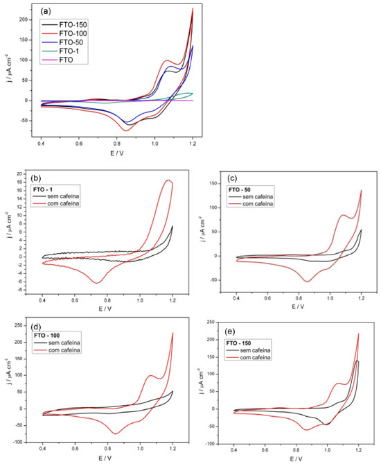 ![]() Figura 1. Voltamogramas cíclicos obtidos - a) na presença de 1,5 mmol L-1de cafeína e comparativos entre as condições com e sem o analito para os eletrodos b) FTO-1; c) FTO-50; d) FTO-100 e e) FTO-150