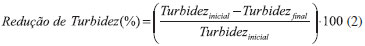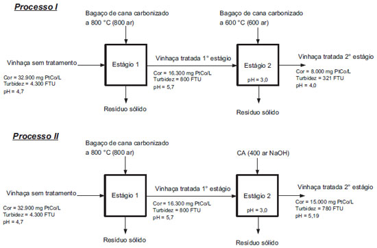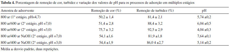 Foram elaborados dois sistemas distintos. No processo I, o efluente pré-clarificado pelo carvão carbonizado a 800 ºC (25 g L-1) foi submetido a um segundo estágio de adsorção utilizando-se uma mesma quantidade da amostra de bagaço carbonizado a 600 ºC. Esta amostra foi escolhida por apresentar capacidade de descoloração em torno de 50%, capacidade superior à apresentada pelas amostras de CA. No processo II o efluente pré-clarificado pelo carvão carbonizado a 800 ºC (25 g L-1) foi submetido a um segundo estágio de adsorção seguinte utilizando-se uma mesma quantidade da amostra CA 400 ar NaOH. Esta amostra foi utilizada por apresentar elevada área específica (Tabela 2) além de capacidade de remoção de cor de 39% (Tabela 3), superior às demais. A Tabela 4 apresenta os valores de remoção de cor, turbidez e pH para o processo de adsorção em dois estágios. Percebe-se que após a primeira etapa há a remoção de aproximadamente 82% da turbidez e 50% de remoção de cor, além da elevação do valor de pH para 5,7.