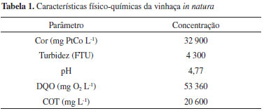 RESULTADOS E DISCUSSÃO Caracterização da vinhaça A Tabela 1 apresenta os resultados de caracterização da amostra de vinhaça in natura. A vinhaça apresentou um pH ácido de aproximadamente 4,7. A acidez do efluente se deve principalmente à presença do ácido sulfúrico que é adicionado ao mosto durante a etapa de fermentação,32 além da presença de matéria orgânica que se encontra basicamente sob a forma de ácidos orgânicos.7 Segundo Espanã-Gamboa et al.,33 os ácidos orgânicos presentes na vinhaça são encontrados basicamente sob a forma de oxalato, lactato, acetato e malato.