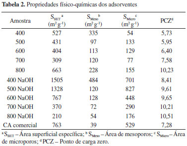 A amostra de vinhaça apresentou elevada concentração de carbono orgânico total (COT) (20600 mg L-1). Este resultado está de acordo com os valores médios reportados pela Cetesb34 (11200 a 22900) para a vinhaça proveniente de melaço de cana-de-açúcar. Segundo Thurman,35 a concentração normal de matéria orgânica dissolvida na água nos interstícios do solo varia entre 2 e 30 mg L-1. Como, no Brasil, em muitas situações a vinhaça é depositada no solo em elevadas proporções (30 a 600 m3 por ano),36 a lixiviação de matéria orgânica pode contaminar os lençóis freáticos, fato que pode acarretar em crescimento microbiológico e consumo de oxigênio dissolvido.35 Observa-se também um elevado valor de demanda química de oxigênio (DQO). No entanto, um dos principais problemas mencionados na literatura em relação à vinhaça é sua intensa coloração marrom escura. A amostra de efluente analisada apresentou elevado valor de coloração (32900 mg PtCo L-1). Segundo Espanã-Gamboa et al.,33 esta coloração se deve principalmente à presença de compostos fenólicos, tais como: melanoidinas, ácido tânico e ácido húmico. Estes compostos são provenientes da reação de Maillard que ocorre entre açúcares (carboidratos) e grupamentos amino de proteínas, caramelos de açúcar superaquecidos e furfural oriundo de hidrólise ácida. Tais compostos são altamente recalcitrantes e prejudicam os tratamentos biológicos aplicados à vinhaça.33 Neste sentido, os processos de tratamento aos quais a vinhaça é submetida visam principalmente a remoção de cor do efluente. Tratamento da vinhaça por adsorção Os testes de adsorção da vinhaça foram realizados utilizando-se adsorventes com características físico-químicas distintas. Utilizaram-se as seguintes amostras: bagaço de cana-de-açúcar sem tratamento; carvões preparados pela carbonização do bagaço de cana-de-açúcar a diferentes temperaturas (400 a 800 ºC), sem ativação; amostras de carvões ativados com NaOH; e uma amostra de carvão ativado comercial (Carbomafra 119). A Tabela 2 apresenta os resultados de caracterização textural para as asmotras de adsorventes utilizadas no presente trabalho.