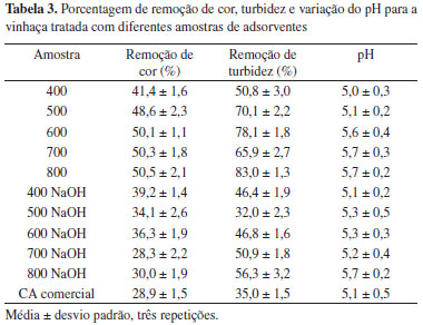 Considerando primeiramente as amostras de bagaço carbonizadas a diferentes temperaturas observa-se, para o tratamemto a 400 ºC, que há inicialmente a decomposição dos materiais mais voláteis presentes no bagaço de cana, gerando com isto um aumento da área específica total do carvão (527 m2 g-1). Conforme a temperatura de carbonização é aumentada, os compostos orgânicos vão sendo degradados, consequentemente o valor de área específica vai se reduzindo. Por fim, quando se atinge a temperatura de 800 ºC, praticamente todo o material orgânico já foi decomposto restando partículas de menor tamanho, resultando em um aumento da área específica total do carvão (663 m2 g-1). É possível notar por meio destes resultados (Tabela 2) que o processo de ativação química proporcionou, de maneira geral, um significativo aumento da área específica dos materiais. O CA com NaOH obtido pela carbonização do bagaço de cana a 400 ºC apresentou a maior área específica dentre as amostras analisadas (1505 m2 g-1), além de um elevado desenvolvimento da mesoporosidade do material (484 m2 g-1). A amostra carbonizada a 500 ºC também se destaca por apresentar um elevado valor de área específica (1328 m2 g-1), observando-se, por outro lado, um alto desenvolvimento da microporosidade do CA (827 m2 g-1). Kalderis et al.37 também analisaram a preparação de CA a partir de bagaço de cana por meio de ativação química (ZnCl2, NaOH e H3PO4) em um único estágio, durante curtos períodos de tempo (30 a 60 min). Os autores encontraram valores máximos de área específica de 674 m2 g-1. Embora as condições experimentais sejam diferentes daquelas avaliadas no presente trabalho percebe-se que o máximo valor encontrado para a área específica (1328 m2 g-1) é consideralmente superior. Observou-se também uma tendência à diminuição da área específica dos materiais conforme a temperatura de carbonização do bagaço de cana foi gradualmente aumentada. Nota-se que para o carvão carbonizado a 800 ºC a ativação química com NaOH promoveu uma redução em sua área específica, de 663 m2 g-1 (carvão) para 210 m2 g-1 (carvão ativado). Indicando a ocorrência de um alargamento dos poros e colapso de sua estrutura resultando numa diminuição da área específica dos CAs. Estes resultados estão de acordo com as conclusões obtidas por Kalderis et al.23 ao avaliarem o efeito da temperatura de pirólise do bagaço de cana sobre o desenvolvimento da porosidade dos materiais. Os autores também observaram a redução da área específica com o aumento da temperatura. A Tabela 2 apresenta também os valores do PCZ para as amostras de adsorventes utilizadas nos testes de adsorção. Como pode ser observado, as amostras de bagaço carbonizadas são tipicamente ácidas quando a temperatura utilizada é inferior a 700 ºC e alcalinas para temperaturas superiores a 700 ºC. Os valores de PCZ variam de 5,37 a 9,71, sendo que há um aumento progressivo deste valor com a temperatura de carbonização. Segundo Suzuki38 o caráter básico apresentado pelos carvões se deve principalmente à presença de moléculas de éter cíclico na superfície dos carvões, sendo que estes grupamentos são formados quando o processo é conduzido a altas temperaturas. Já os carvões ácidos apresentam complexos oxigenados presentes em sua superfície, sendo que esses óxidos provêm do material de origem ou da adsorção química do ar (oxidação) durante a carbonização. As amostras de carvão ativadas com NaOH apresentam valores de PCZ superiores, indicando que o processo de ativação promove alterações nos grupamentos superficiais do material. A Tabela 3 apresenta os valores de porcentagem de remoção de cor e turbidez bem como a variação dos valores de pH do efluente após o tratamento de adsorção em CA.