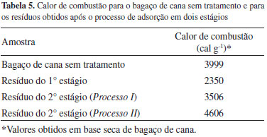 Esta elevação do pH do efluente após o primeiro estágio pode interferir negativamente no processo de adsorção seguinte. Segundo Caqueret et al.,42 a adsorção de compostos orgânicos e principalmente de compostos polifenólicos são fortemente dependente dos valores de pH da solução. Quanto mais ácida for a faixa de pH, mais eficiente será a adsorção. Neste sentido, avaliou-se o efeito da variação do pH da solução sobre a capacidade de descoloração do segundo estágio de adsorção. Foram avaliados um valor de pH neutro (pH = 7) e um valor na faixa ácida (pH = 3). Os resultados são apresentados na Tabela 4. É possível notar que para a amostra carbonizada a 600 ºC, a variação do pH afeta o resultado de remoção da cor e da turbidez do efluente. O pH ácido favorece a adsorção, neste caso, as porcentagens de remoção de cor e turbidez foram superiores, alcançando os valores de 75,7 e 92,5%, respectivamente. De acordo com Qi et al.,44 a redução na capacidade de adsorção em um intervalo básico de pH (7-10) pode estar relacionada à desprotonação tanto dos grupos funcionais ácidos da superfície do CA como das moléculas carboxiladas presentes na solução, tais como os compostos fenólicos. Em valores de pH mais elevados, as interações eletrostáticas são máximas e envolvem as forças de repulsão entre as moléculas dissociadas e os grupos funcionais da superfície do CA. Estas forças de repulsão podem impedir as interações específicas das moléculas com a superfície do CA, especialmente as ligações de hidrogênio. No entanto, para a amostra 400 ar NaOH verifica-se que o valor de pH não afeta a capacidade de adsorção do sistema. Para este caso, observou-se apenas uma remoção adicional de 4% de cor e turbidez. Este fato está relacionado ao valor de PCZ das amostras utilizadas. A amostra 400 ar NaOH apresenta um valor de PCZ igual a 8,41 (Tabela 2). Como este valor ainda encontra-se acima do pH do efluente (5,7), a superfície do CA ainda encontra-se carregada positivamente e variações no valor de pH da solução não afetam a capacidade de adsorção. Já a amostra de bagaço carbonizada a 600 ºC (600 ar) apresenta um PCZ correspondente a 6,4 (Tabela 2), valor que se encontra bem próximo ao pH do efluente tratado. Neste caso, a acidificação da solução auxilia as forças atrativas de adsorção. Em relação à capacidade de remoção de DQO, os resultados mostraram que após o primeiro estágio houve uma remoção de 43% de DQO. Após o segundo estágio, para o processo I, o percentual de remoção de DQO alcançou o valor de 69%. A capacidade de remoção de DQO observada é superior se comparada ao resultado obtido por Beltran et al.,45 que relataram remoção de DQO de 33,7% depois de 5 h tratamento com ozônio, evidenciando a eficiência do tratamento de adsorção em dois estágios para a diminuição do poder poluente da vinhaça. A adição de um terceiro estágio de adsorção também foi analisada, no entanto, não se observou alteração significativa na redução dos parâmetros analisados. Caqueret et al.46 avaliaram a capacidade de adsorção de compostos polifenólicos contindos na vinhaça de beterraba em carvão ativado comercial, por meio de um sistema de adsorção em contracorrente. Os autores concluíram que após quatro estágios de adsorções a 25 ºC, utilizando uma proporção em peso de 47 solução/CA é possível alcançar uma redução da concentração de compostos polifenólicos de 5.33 para 0,007 eq g L-1. Bernal et al.47 avaliaram um processo de remoção de cor da vinhaça de beterraba por adsorção/ultrafiltração em carvão ativado. Os autores obtiveram uma remoção de cor de 97% por meio da ultrafiltração em membrana cerâmica da suspensão de vinhaça mais CA, em uma concentração de de 5g de CA (Norit) por litro de vinhaça, pH 3 e três horas de filtração. Neste caso, após três horas de filtração o fluxo da membrana foi reduzido a aproximadamente 20 kg m-2 h-1, sendo que a capacidade de descoloração da vinhaça foi atribuída unicamente ao processo de adsorção no CA. Aproveitamento energético do resíduo da adsorção O presente trabalho propõe que após o processo de tratamento da vinhaça por adsorção, o resíduo sólido gerado possa ser incinerado nas caldeiras da própria usina. Com isto, o potencial energético destes resíduos seriam aproveitados. Além disso, seriam evitados problemas com a disposição inadequada destes materiais. Os calores de combustão obtidos para amostras de bagaço de cana sem tratamento e para os resíduos do primeiro e segundo estágios de adsorção são apresentados na Tabela 5. É possível observar que estes materiais ainda possuem elevado potencial energético.