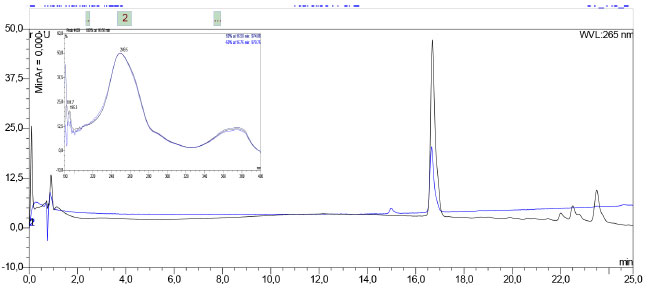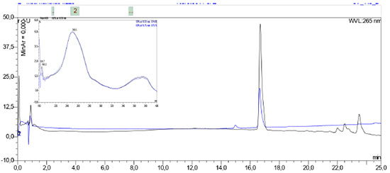 Análise do espectro ESI-EM de alta resolução da substância 2 registrado no modo negativo apresentou íon pseudomolecular em m/z 461,0785 [M - H]-, sugerindo fórmula molecular C21H18O12 (requer 461,0720). Análise do espectro no IV indicou bandas características de grupos hidroxílicos em 3421 cm-1 , deformação axial de hidrogênios ligados a carbono sp3 dos grupos metoxilas em 2958 - 2927 cm-1 e carbonila de lactona insaturada em 1751 cm-1 . No espectro de RMN de 1H da substância 2 pode-se observar dois singletos na região de hidrogênios ligados a sistema aromático (δ 7,65 e δ 7,39) e integrados para um hidrogênio cada. Estes dados, juntamente com os dados de EM, indicaram a presença de dois anéis aromáticos pentassubstituídos. Verificou-se também a presença de um dubleto em δ 5,10 (J = 6,6 Hz) característico de hidrogênio ligado ao C-anomérico de O-glicosídeo, que corrobora devido às multiplicidades dos demais hidrogênios do glicosídeo observadas entre δ 3,15 e δ 3,45. Outros dois singletos referentes a grupos metoxilas (δ 4,06 e δ 4,02) também foram observados e corroboraram com dados no IV. O espectro de RMN de 13C de 2 registrou esses sinais característicos de uma unidade de xilose, incluindo o carbono anomérico em δ 102,6. O espectro de RMN 13C-APT revelou a presença de doze carbonos não hidrogenados, seis metínicos, um metilênico e dois oximetílicos. Os deslocamentos químicos observados para as metoxilas (δ 61,6 e δ 62,3) são indicativos que ambas estão impedidas, ou seja, orto-dissubstituídas. No espectro de RMN de 13C foram registrados sinais similares e característicos de grupos acilas de lactonas (δ 158,7 e δ 158,8) ligadas diretamente a anéis aromáticos. Análise do mapa de contorno gHMQC permitiu correlacionar diretamente os carbonos com os respectivos hidrogênios. No entanto, experimento de gHMBC permitiu estabelecer os sinais que fazem parte de cada unidade aromática. A análise do experimento de NOESY permitiu observar, entre outras, a correlação de H-5' (δ 7,65) com hidrogênio anomérico H-1" (δ 5,12), possibilitando assim localizar o O-glicosídeo na posição 4'. Estes dados possibilitaram caracterizar 2 como ácido 3,3'-dimetoxi-4-hidroxielagico-4'-O-β-D-xilopiranosideo, um metabolito que ocorre especialmente nas famílias Rosaceae12 e Euphorbiaceae,13-15 mas ainda não descrito em espécies da família Fabaceae. A análise por CLAE-DAD das substâncias 1 e 2, submetidas às mesmas condições cromatográficas de análise, registraram espectros no UV idênticos, devido ao cromóforo comum as substâncias em questão, além de tempos de retenção (tR) diferentes. A hidrólise do glicosídeo em 2 seguida de análise por CLAE-DAD, sob as mesmas condições iniciais de análise, apresentou um pico com o mesmo tR quando comparado com a substância 1 (Figura 2). Portanto, os dados de RMN de 1H e de 13C foram suficientes para identificar 1 como ácido 3,3'-dimetoxi-4,4'-dihidroxielágico.