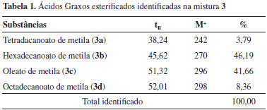 Os dados de RMN de 1H e de 13C da mistura 3a, 3b, 3c e 3d revelaram a presença de ésteres metílicos derivados de ácidos graxos e sua formação pode estar relacionada com a utilização de MeOH nos procedimentos de extração empregados. A análise direta por CG/EM deste óleo e comparação dos tempos de retenção com o cromatograma do padrão mix C4-C24 FAME foram suficientes para determinar a composição da mistura, como sendo composta majoritariamente por hexadecanoato de metila (3b) e oleato de metila (3c) (Tabela 1).