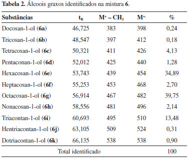 A substância 4 e a mistura 5a-5b apresentaram colorações características de substâncias de natureza terpênica e esteroidal quando submetidas ao teste com reagente Liebermann- Burchard. Análise dos dados de RMN de 1H e de 13C da substância 4, juntamente com comparação dos dados descritos na literatura,16 permitiu identificar esta substância como sendo o lupeol. Por outro lado, na mistura 5, os dados de RMN de 1H e de 13C, bem como análise por CCDC com amostra autêntica comprovaram que a mistura era composta por β-sitosterol (5a) e estigmasterol (5b). Essa mistura foi também encontrada no extrato MeOH das flores de P. pyramidalis. O fracionamento em sílica gel da fase diclorometano das flores de P. pyramidalis seguida de recristalização em hexano possibilitou a obtenção de uma mistura de alcoóis graxos saturados, caracterizados por RMN de 1H. Dentre os sinais característicos, observou-se dois tripletos, um deles integrando para dois hidrogênios oximetilênicos (δ 3,52; J = 6,6 Hz). O tripleto em δ 0,81 (J = 6,9 Hz) também é indicativo de metilas terminais comumente observados em substâncias com cadeia alquílica linear. O espectro no IV corroborou com os dados do RMN, pois foram registradas bandas referentes à deformação axial de grupos hidroxílicos em 3309 cm-1 e de hidrogênios ligados a carbono sp3 na região 2916 - 2848 cm-1 . O espectro de RMN de 13C apresentou nove sinais no total. Dentre os sinais observados, os registrados em δ 63,0 e δ 14,1 confirmam a presença de carbono oximetilênico e metílico terminal, respectivamente. Os demais sinais são referentes às unidades -CH2- (metilênicos) presentes na estrutura carbônica, que a caracterizam como sendo de álcool de cadeia longa. Para identificação dos álcoois foram preparados derivados sililados da mistura.17 Os compostos derivatizados foram analisados por CG/EM e identificados de acordo com as fragmentações propostas a partir dos espectros de massas obtidos, em comparação com espectros existentes no banco de dados (Wiley 229.000) do equipamento e com dados da literatura.18 Antes de caracterizar os componentes na mistura, os espectros de massas (EM) foram analisados e considerados apenas os que possuíam fragmentações características para alcoóis graxos sililados. Após identificar os padrões de fragmentação dos alcoóis graxos foi possível verificar que a mistura era composta de onze alcoóis graxos homólogos (Tabela 2).