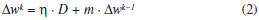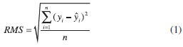 O neurônio artificial proposto implementa: xm são sinais de entrada da rede; wkp são pesos ou pesos sinápticos, associados a cada entrada; bk é o termo bias; uk é a combinação linear dos sinais de entrada; Σ é a função de somatório; ϕ(.) é função de ativação; yk é a saída (única, em direção a outros neurônios). Um conjunto de neurônios artificiais conectados entre si representam uma Rede Neural Artificial (RNA), que tem como objetivo processar um conjunto de dados de calibração, inseridos na camada de entrada da rede, propagando-se por cada neurônio, o qual terá um número de entradas e uma saída. Os resultados, medidos através do sinal de saída, constitui-se no cálculo do menor erro RMS ("Root Mean Square") ou erro quadrático médio, segundo a Equação (1), dirão se a rede conseguiu "aprender" o padrão que busque descrever o sistema estudado. Os pesos são os parâmetros ajustáveis da rede e devem ser reajustados à medida que o conjunto de calibração é apresentado à rede. O processo de aprendizado supervisionado da RNA resulta no ajuste dos pesos de tal forma que o valor de saída (estimado) da rede seja o mais próximo possível do valor desejado. ![]() em que yi é a saída calculada e ŷi é a saída da calibração. Uma vez aprendido o padrão, dados novos são utilizados para determinar a acuidade do treinamento. É esperado que os valores de erro RMS oriundos dos testes sejam tão baixos quanto do conjunto de calibração. Arquitetura (otimização) Um importante aspecto das RNA é a sua arquitetura, pois a configuração da rede neural depende da particularidade do problema que se quer resolver,12 restringindo sua aplicação para outros problemas sem a sua devida reconfiguração. Deste modo, antes de ser utilizada, a arquitetura da RNA necessita representar os dados com os quais se pretende trabalhar, para que seja possível mapear as relações não-lineares entre sua(s) entrada(s) e a saída pretendida. Alguns dos parâmetros que modificam esta arquitetura são: i) o número de neurônios da camada de entrada; ii) o número de camadas intermediárias, situadas entre a camada de entrada e a de saída; iii) número de neurônios de cada camada intermediária (para mais de uma). Algoritmo de treinamento Backpropagation O algoritmo de correção dos pesos sinápticos utilizado neste experimento é o Backpropagation (BP), ou Retropropagação, cuja principal aplicação é a modelagem de dados não-lineares, ou seja, que não apresentam uma função de ordem definida para o comportamento matemático das variáveis.13 Na Equação 2, é resumido o cálculo da correção de pesos deste algoritmo de treinamento: ![]() onde: Δwk representa a diferença entre os pesos inicial e final para a iteração k; η é chamado de "taxa de aprendizagem"; D é a derivada do erro calculado através da função de transferência; m é chamado de "momento" e evita a possibilidade de se encontrar um mínimo local; Δwk-1 representa a diferença entre os pesos inicial e final para a iteração k - 1.