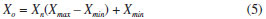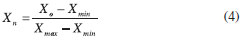 Os experimentos de treinamento devem parar em duas condições específicas i) quando o valor configurado da variável "Erro Máximo" for alcançado; ii) ou quando o valor configurado da variável "Limite de iteração" for alcançado. Antes de sua utilização na rede neural, o conjunto total de amostras é dividido em dois conjuntos, contendo os dados de treinamento (ou calibração), que visa promover o aprendizado da RNA, e outro contendo os dados de teste ou verificação, responsável por verificar a capacidade de generalização da rede, sendo que neste trabalho foram utilizadas 109 amostras (70%) como dados para treinamento e 46 amostras (30%) como dados para verificação. Condicionamento dos dados para processamento Os dados do referido ponto de amostragem estão gravados em arquivo com formato de texto puro (arquivos em texto puro são caracterizados por não incorporarem, em seu conteúdo, informações sobre formatação dos dados, nem mesmo formatação de caracteres, como negrito, itálico, fonte, ou tamanho de folha, margens, etc., estando limpos e por este motivo, são os mais indicados para transportar dados entre plataformas (sistemas operacionais) e programas diferentes) contendo as informações de cada parâmetro físico-químico e os valores de suas leituras, oriundos das análises das amostras de água bruta. Para minimizar problemas oriundos do uso de unidades e faixas de valores distintos entre os parâmetros, faz-se necessário que dados multivariados sejam normalizados, padronizados em uma mesma escala. A utilização de redes neurais com função de transferência sigmoidal exige que estes dados estejam normalizados no intervalo [0,1]. Esta função é a que melhor apresenta resultados para aplicações em dados não lineares, por isto foi escolhida para este trabalho.17 Foi desenvolvido um script no ambiente computacional Scilab para implementar esta técnica de normalização linear no intervalo [0,1], de acordo com a seguinte equação 4: ![]() A função de normalização inversa obedece à equação: ![]() sendo: Xo : x original; Xn : x normalizado; Xmax : maior valor de x por parâmetro; Xmin : menor valor de X por parâmetro.
