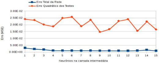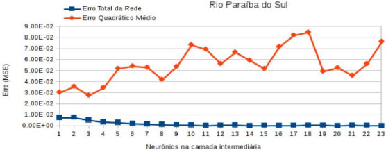 ![]() Figura 2. Erro Total da Rede e Erro Médio Quadrático da rede (10-x-1) para o Rio Paraíba do Sul