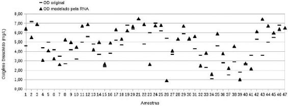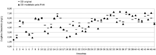 A partir do treinamento da rede de arquitetura (8-9-1), é possível normalizar inversamente os dados de saída da rede com a finalidade de verificar a distância destes dados com o alvo do treinamento, o valor real de Oxigênio Dissolvido. A Figura 5 apresenta os valores iniciais da variável OD, antes de serem padronizados e utilizados no conjunto de teste, contra o OD modelado pela rede, depois da efetuada a normalização reversa.