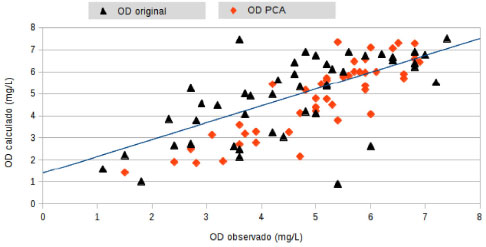 A Figura 6 apresenta a comparação conjunta entre os pares ordenados representando os valores de OD para o Rio Paraíba do Sul, modelados a partir de dados reais e os advindos do método de PCA. Como se verifica, o maior distanciamento dos pontos que representam os dados originais da linha de tendência demonstra que as maiores amplitude e grau de não linearidade dos dados reais deste manancial aumentaram o erro de treinamento da RNA, o que provoca automaticamente o distanciamento entre o valor modelado e original. A partir da análise dos dados advindos do método de PCA, verifica-se que a utilização de oito componentes principais (que representam 90,02% de variância) como entrada da RNA proporcionou um resultado melhor se comparado com o encontrado com a utilização dos dados originais, com pontos mais próximos da linha de tendência. Testes posteriores mostraram que um número menor ou maior do que 8 componentes principais não proporcionaram resultados melhores para o coeficiente de correlação R.